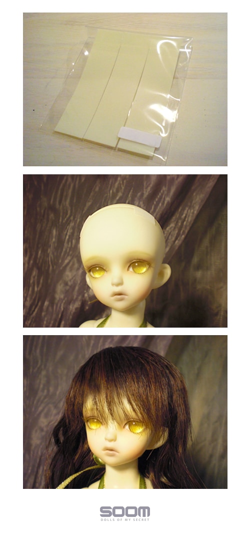 인형 헤드 부분에 벨크로 테이프를 사용하여 가발을 고정합니다.